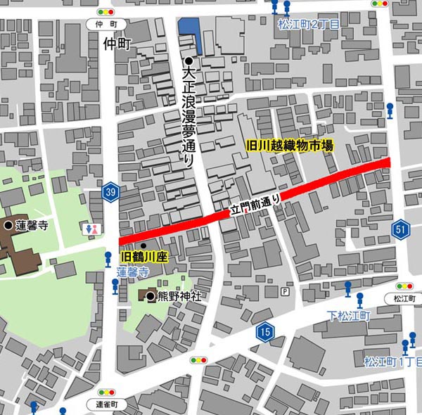 ここは川越蓮馨寺からまっすぐ伸びる立門前通りです。大正浪漫通りと交差しています。