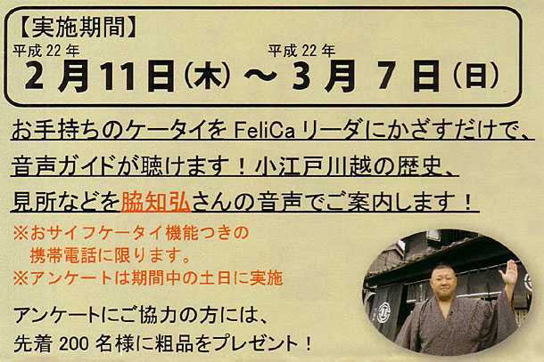 川越市内の10箇所の観光スポットで携帯電話による音声案内するサービスが、