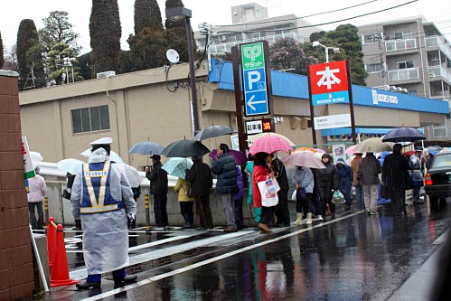 今日(2月27日)、川越市藤間の川越街道沿いに大型スーパー「サミット川越藤間店」がオープンしました。午前10時のオープン時には、みぞれの降る悪天候の中、傘を差したお客さんが入店するため長蛇の列を作っていました。列は下の写真に写るマンションに向かう脇道にも蛇行して続いていました。川越街道も午前中はサミット渋滞で東京方面へ向かう道は遅々として進まず、これまた長い列が出来ていました。