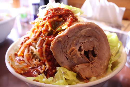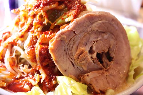 野菜が大盛り過ぎてなかなか麺まで辿り着きません。が、なかなかいけますよ~!ようやく出てきた麺は褐色のうどんみたいな太さ!しかし、味はもちろんラーメンです。この麺もいけます!固茹ででグッド。濃厚なスープに良く絡ませるためにはうどんみたいに太くないといけません。そうしないと麺がスープに負けてしまいます。大きなチャーシューもトロットロッ!チャーシューもいけますよ~!野菜→麺→野菜→スープ、野菜と麺→野菜→スープ、ノックアウトされてたまるかと、必死になって頂きました。20分後、見事完食!