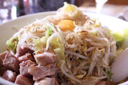 こちらは油そば。900円。こちらも辛みそラーメンと同じくトッピングを無料で増量出来ます。やはりすごいボリュームです。ベースの出汁は辛みそラーメンと同じですが、お醤油味で辛さが無く、乗っかっている生卵を混ぜて食べるので味がまろやかになります。油そばだからもっとギトギトかと思いきや、意外と油っぽさは感じませんでした。麺も辛みそラーメンと同じ太麺。これもトッピングと少な目のスープによ~く混ぜて食べるといけますね~!