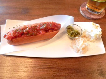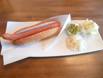 こちらはプレーンのホットドックに温かいマッシュポテト、ピクルス、サワーキャベツ、