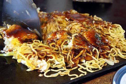 クレープ状に薄く伸ばされた生地に、鰹節粉が掛けられ、次にきゃべつ、天かす、もやし、肉と乗せられ、最後にうどんと卵が合体!ご主人の手際の良さと言ったら!ささっと適当に作っているようでいて、ちゃんと頃合いを見計らって次の工程に入っているので、皮の周りのパリパリ感、きゃべつやもやしの火の通り具合が絶妙です。出来上がりにはおたふくソースがたっぷり掛けられています。