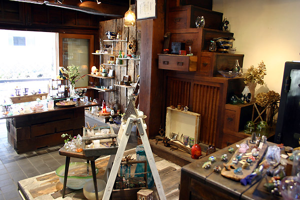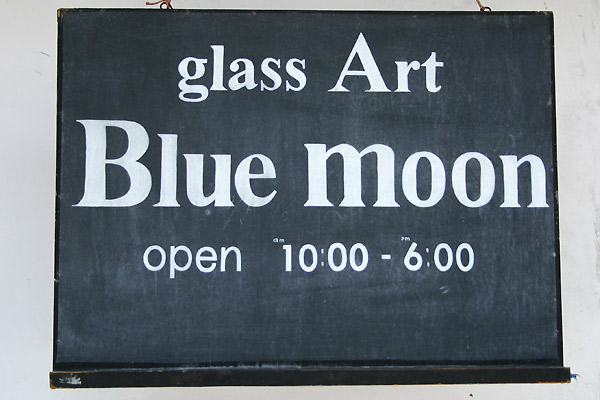 「glass Art Blue moon(グラスアートブルームーン)」。蔵造りの木造の建物とガラスの数々が不思議と調和して、雰囲気のあるお店です。