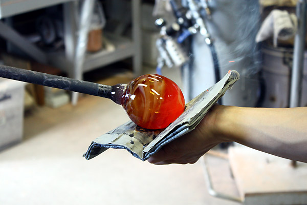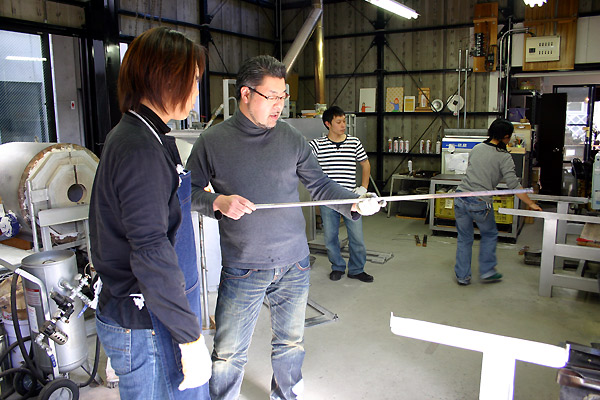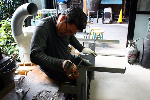 陶芸などは自分の納得の行くまで、形を思うように変えていくことが出来ますが、ガラス作りは時間と温度との戦い。ガラスに動きがあるから、作るこちらも常に動いていなければならず、一発勝負的なところもあります。同じ「物作り」でも土とガラスとではずいぶんと様子が違いました。