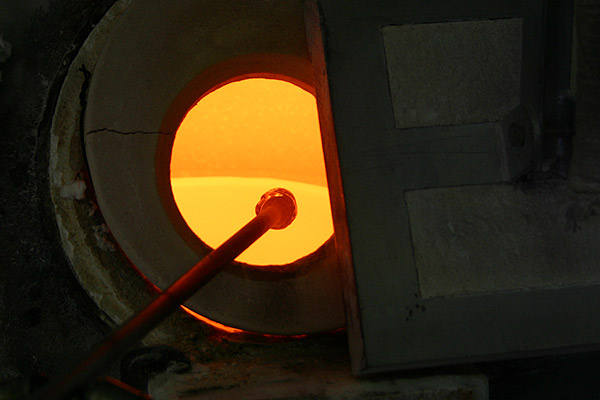 ガラスの溶けている窯裏手の工房へ行くと、窯の中でガラスがゴウゴウとオレンジ色に溶けています。