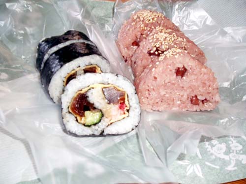 和菓子と一緒に赤飯おにぎり、山菜おこわおにぎり、太巻等もあります。