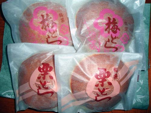 どら焼きは個別に袋包装になっています。梅どらは餡が薄いピンク、細かな紫蘇が混ざっている様でした。真ん中に半分の梅が入っています。栗どら焼きは白餡で中に栗が入っています。他にもバターどら焼き、生クリームどら焼き、餡なしどら焼き等もありました。