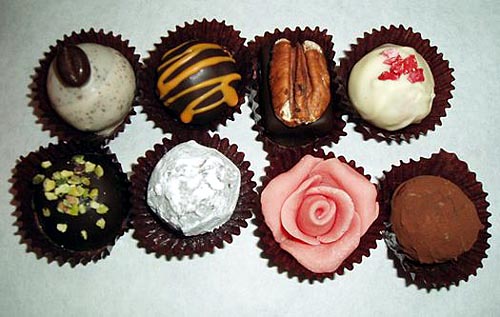 左は3色の綺麗なローズチョコレート、沢山の色が楽しいノワゼットショコラ、右はカラフルチョコビスケット、下は2個入りから揃うチョコレート詰め合わせ。