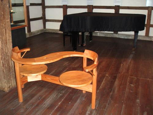 1F奥は抹茶茶碗、大皿等の作品が飾られたギャラリースペース。変わり椅子の座り心地もとても良かったです。時にはコンサートホールとして利用される事もあるそうです。